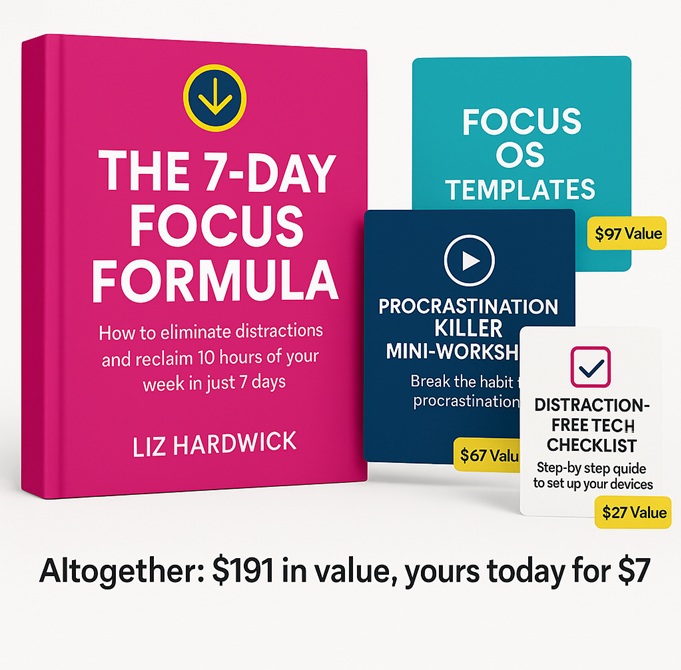 The 7‑Day Focus Formula is a counterintuitive approach to getting your attention back so you can do deep work consistently. It lets you reclaim 10+ hours a week, finish meaningful tasks, and feel in control again — without learning some giant “productivity system,” installing a dozen new tools, or relying on willpower.