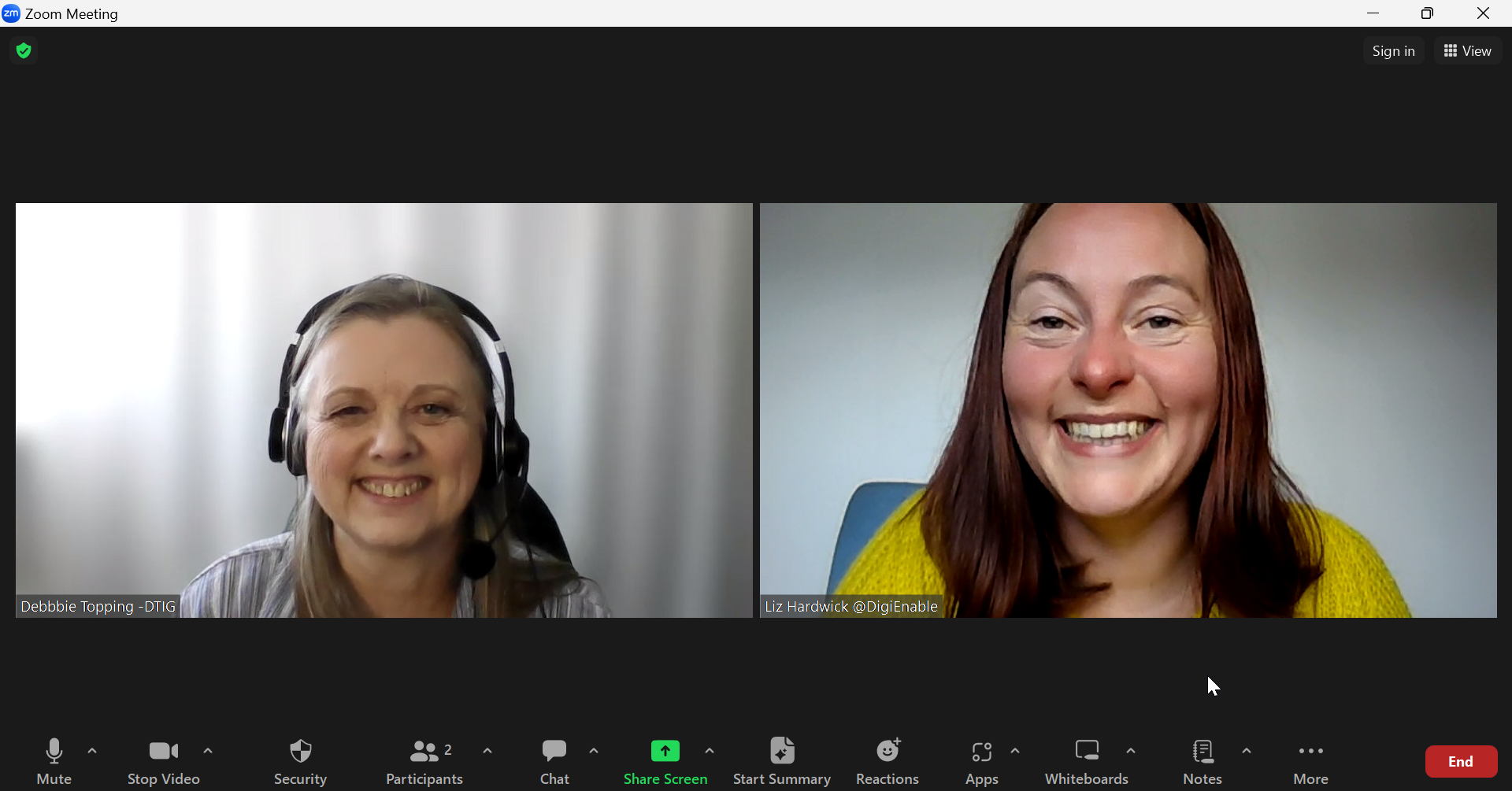 Bookings are easy and automated. You can book straight into Liz's calendar direct 24/7, on a rolling 6-month-ahead basis, enabling you to prioiritse your coaching sessions in your schedule well in advance, at a time when you have headspace to review the best options for you. Here's fellow trainer Debbie with Liz on Zoom, enjoying a productive coaching session focused on actionable next-steps. She particularly enjoys the flexibility online brings as she has a very busy GDPR training and consultancy business and can slot sessions in around her own delivery.
